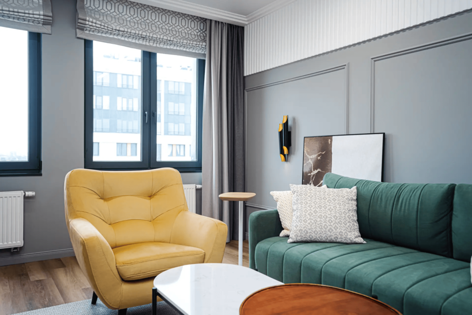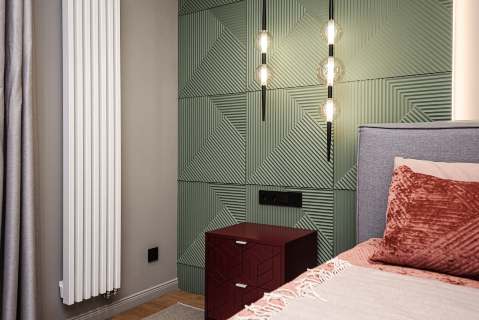 В нашем проекте мы использовали яркую палитру, добавив к серой базе синий, желтый, зеленый и красный. Желтые и синие бархатные стулья на кухне и кресло в гостиной мгновенно создают фокусную точку и заряжают атмосферу энергией. Зеленый диван и акцентная стена в спальне привносят спокойствие и баланс, а точечные красные акценты (тумба в спальне, покрывала и подушки) добавляют интерьеру тепла и динамики.