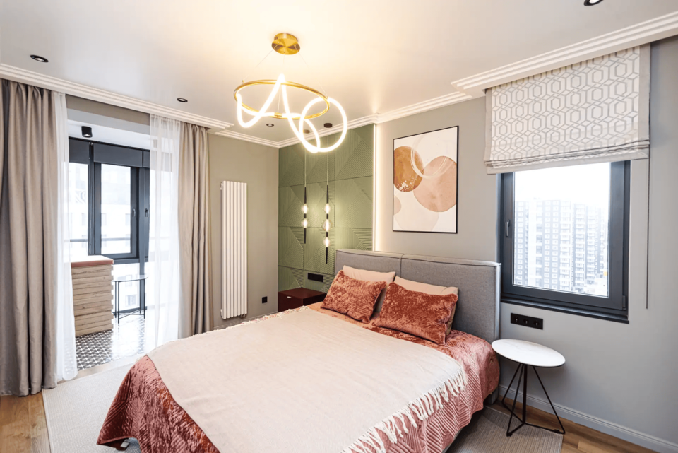 Освещение продумано до мелочей. Теплые подвесные лампы над обеденным столом подсвечивают желтые стулья, создавая невероятно уютную атмосферу для вечерних разговоров. Многоуровневая подсветка в спальне (подвесной светильник на потолке, акцентные плафоны на стене, светодиодная лента, бра) обыгрывает текстуры стен, добавляя глубины.