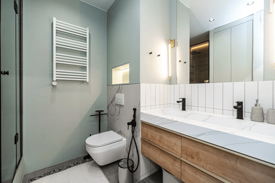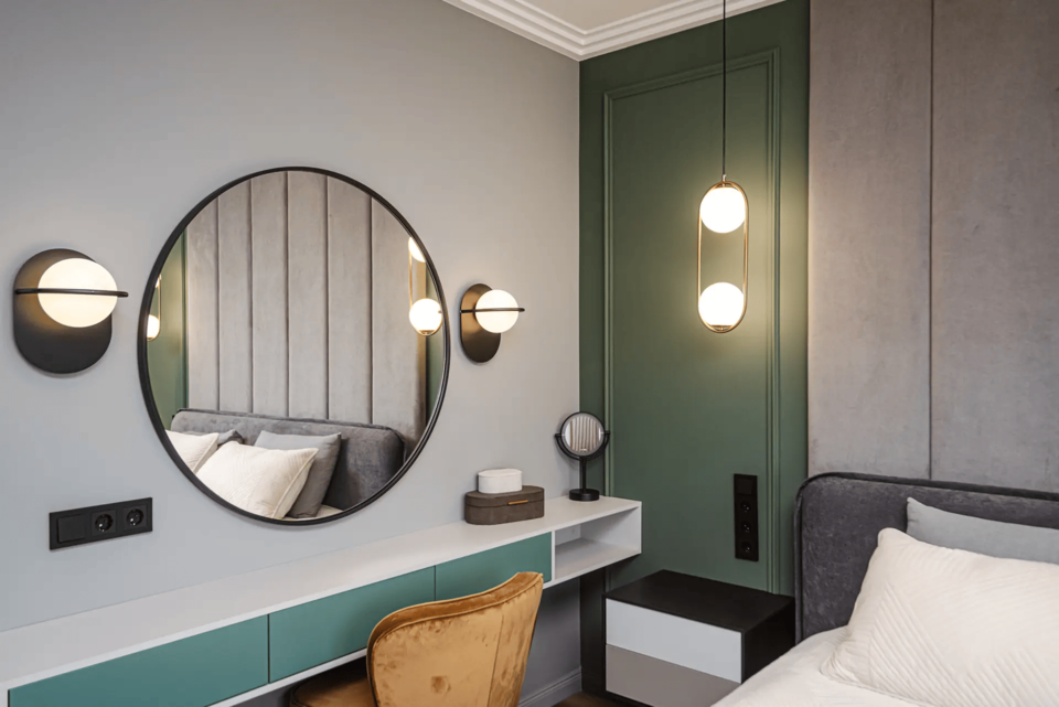 Мы добавили минималистичные картины, керамические украшения и круглое зеркало с подсветкой – все это отражает не только свет, но и характер хозяев.