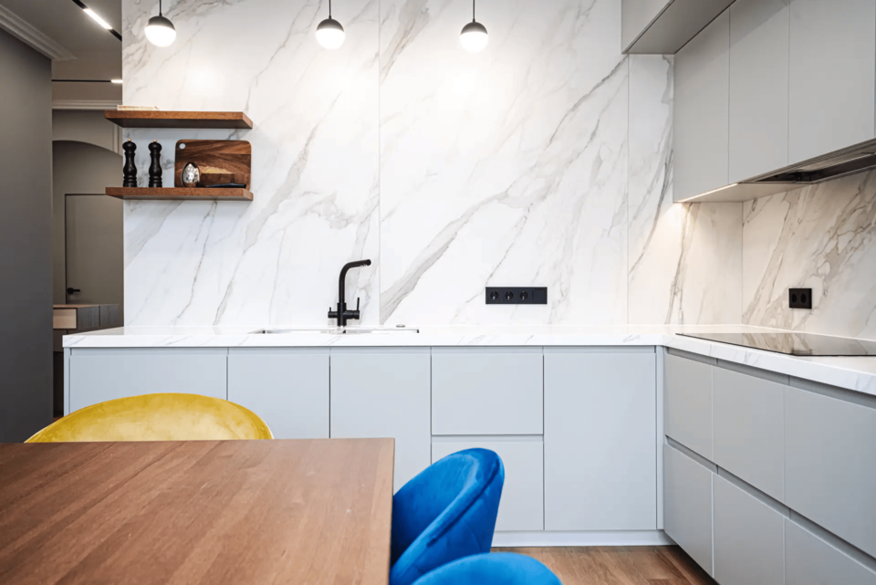 Для кухни мы выбрали сдержанный матовый гарнитур без лишней фурнитуры – его прохладная лаконичность создает идеальный фон. Фартук с мраморным принтом поддерживает общую строгую эстетику. Тепло в эту зону вносят дерево столешницы и напольного покрытия.