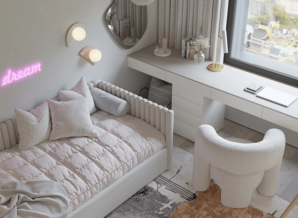 Детская – мир, где цвет должен вдохновлять на творчество,не перегружая. В этой детской дизайнеры SNATEK использовали трендовый оттенок для стен и мебели, создав атмосферу сказки. Стены в этом оттенке визуально расширяют комнату, а неоновая надпись добавляет игривости, не нарушая гармонии. Мягкая белая кровать с пушистыми бортами и подушками доминирует в композиции Белый гармонично сочетается с пастельными текстильными элементами и деревянным полом, делая пространство легким и безопасным.