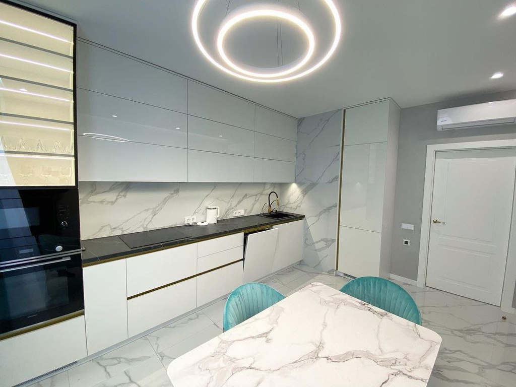 Планировка учитывает все сценарии использования: линейная зона приготовления с мойкой сочетается с полноценной обеденной зоной. Встроенная техника скрыта за глянцевыми белыми фасадами, сохраняя чистоту линий.