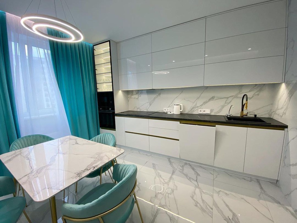 Глянцевые белые фасады шкафов отражают свет, раздвигая пространство и создавая ощущение простора. Мраморная тема развивается в отделке пола, фартука и стены. Яркие синие бархатные стулья и шторы контрастируют со светлой палитрой, внося в интерьер динамику.