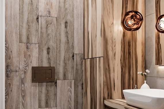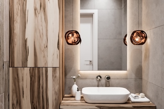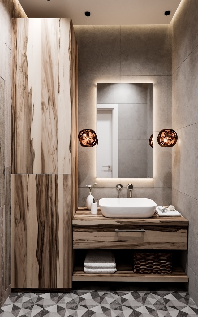 Подвесная раковина на деревянной тумбе и компактный унитаз экономят пространство, а высокий шкаф у двери решает вопрос хранения. Большое зеркало с LED-подсветкой и подвесные светильники в бронзе наполняют комнату мягким светом, выгодно обыгрывая текстуру дерева.