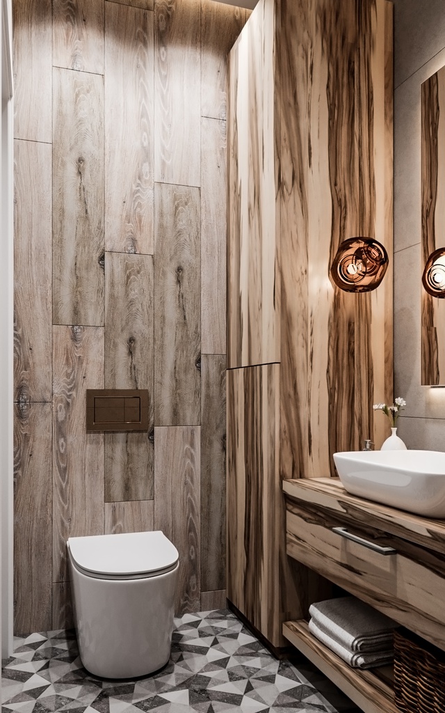 Для этого гостевого санузла мы создали лаконичное и теплое пространство. Натуральное дерево на стенах сочетается с серыми панелями, создавая спокойную атмосферу. Пол с геометрическим узором зрительно расширяет помещение.