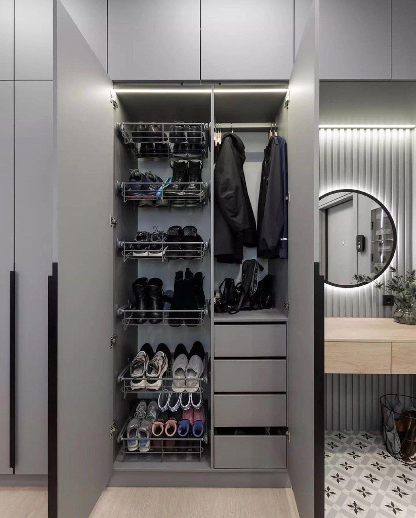 Внутри шкафов продуманная организация: полки для сумок, вешалки для верхней одежды и сетчатые корзины для обуви.