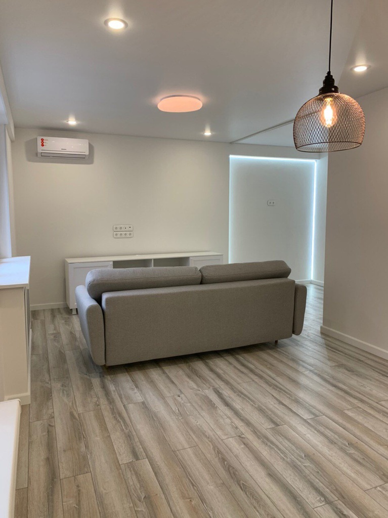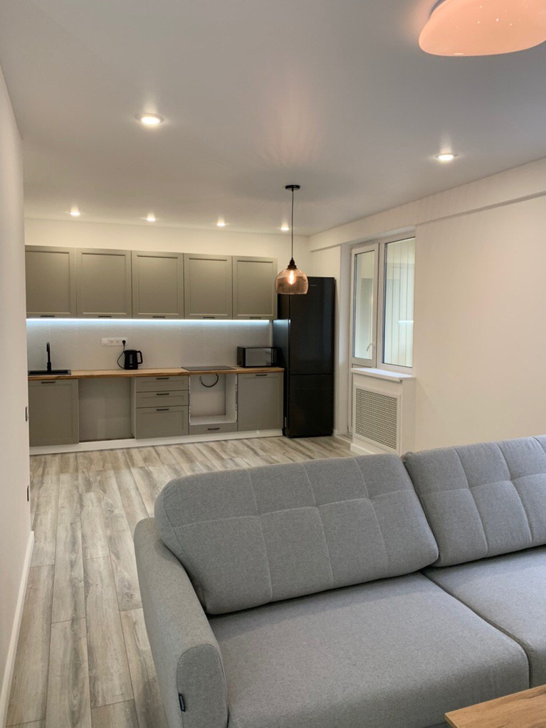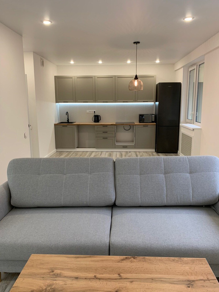 В объединенной кухне-гостиной мы смонтировали кухонный гарнитур с серыми глянцевыми фасадами, индукционной плитой и встроенной техникой. Обеденную зону с деревянным столом дополнили подвесными лампами. В жилой зоне установили угловой диван и смонтировали кондиционер. Большие окна и продуманное освещение делают пространство светлым и уютным.