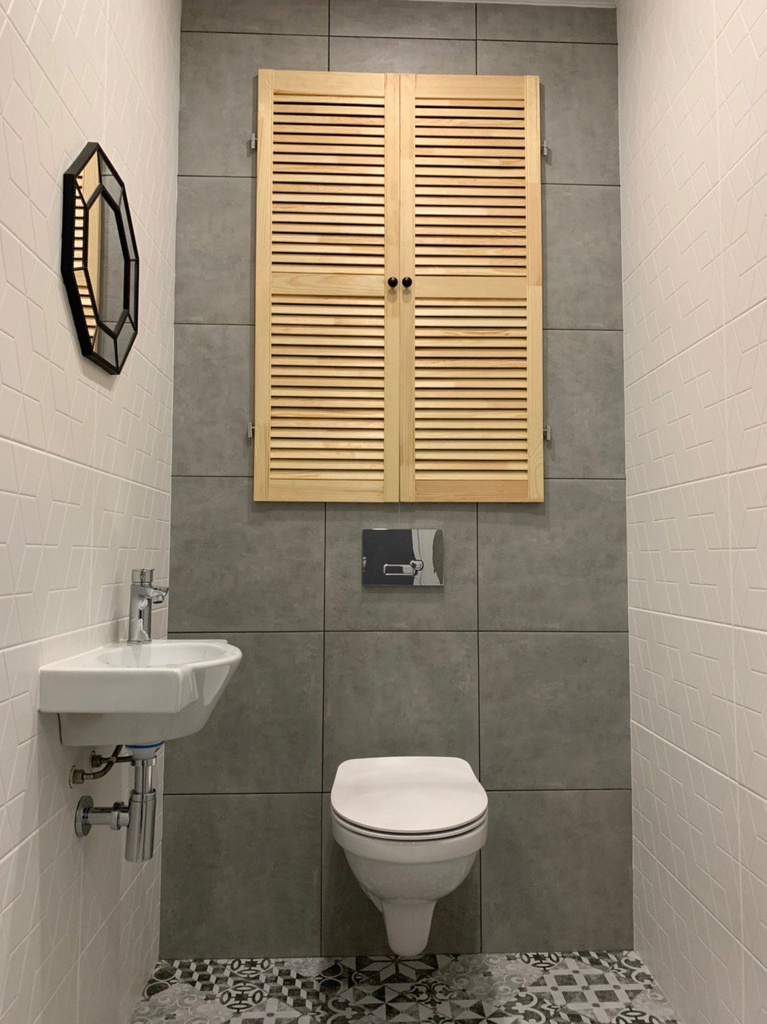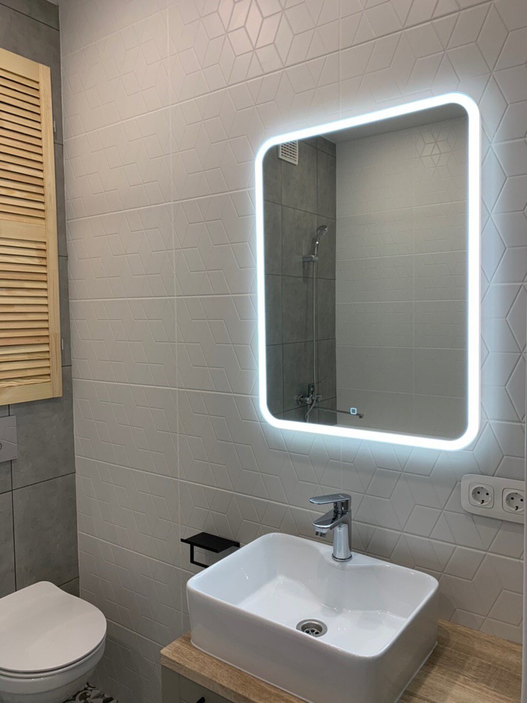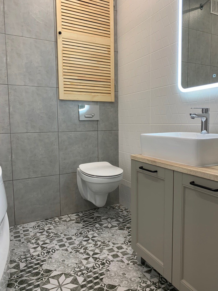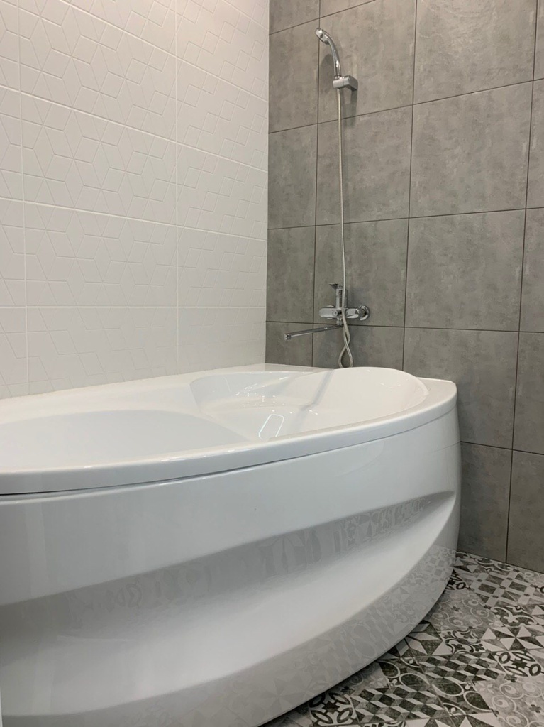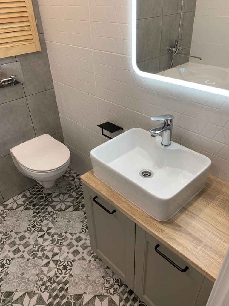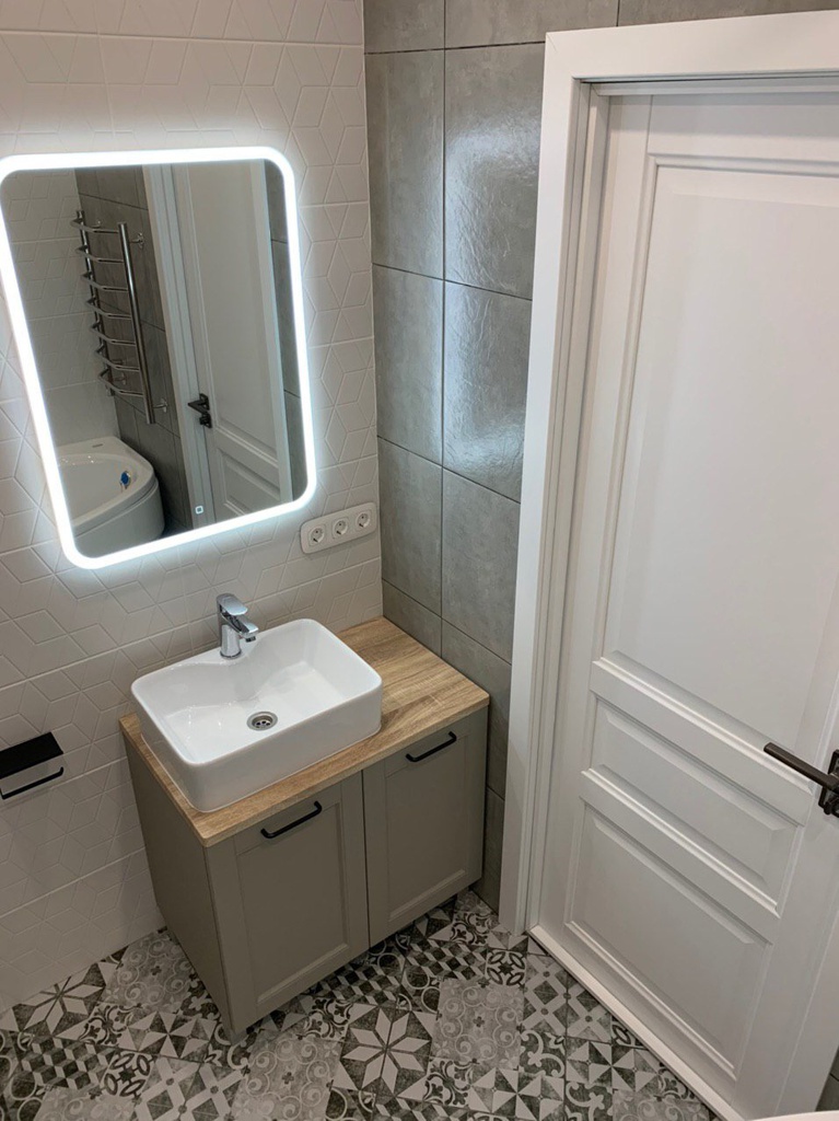 В санузле выполнена укладка белой и серой плитки, установлена душевая кабина и подвесная тумба с раковиной. Основным акцентом стала угловая ванна и круглое зеркало со встроенной LED-подсветкой. Все работы проведены с использованием экологичных и влагостойких материалов.