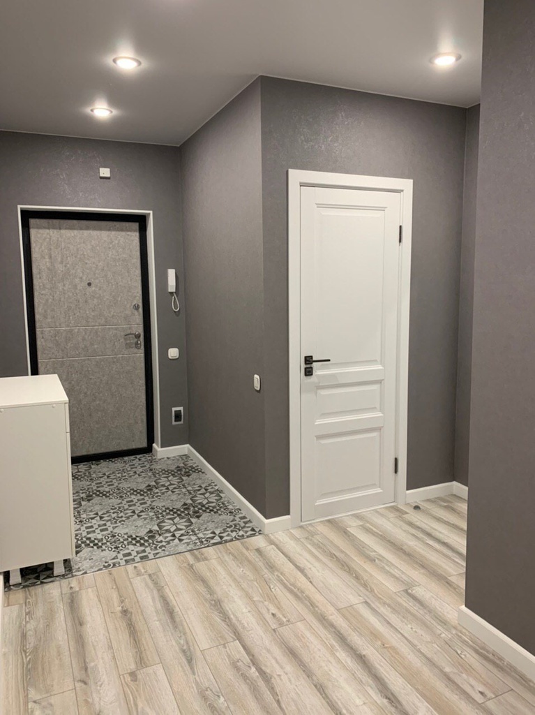 Для прихожей выбрали белую входную дверь, встроенный шкаф и настенные бра на гибких кронштейнах. Стены отделали декоративной штукатуркой серого цвета. Проемы оформили белыми филенчатыми дверями, визуально объединяющими пространство.
