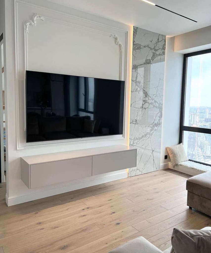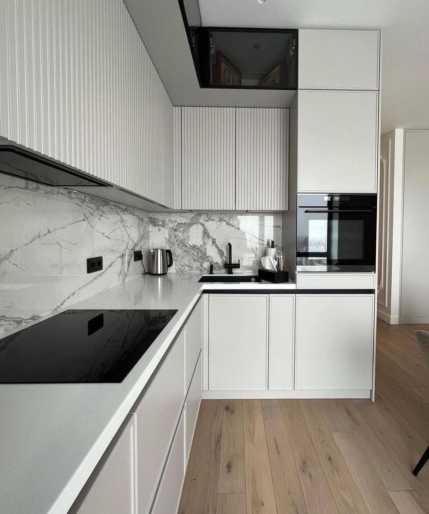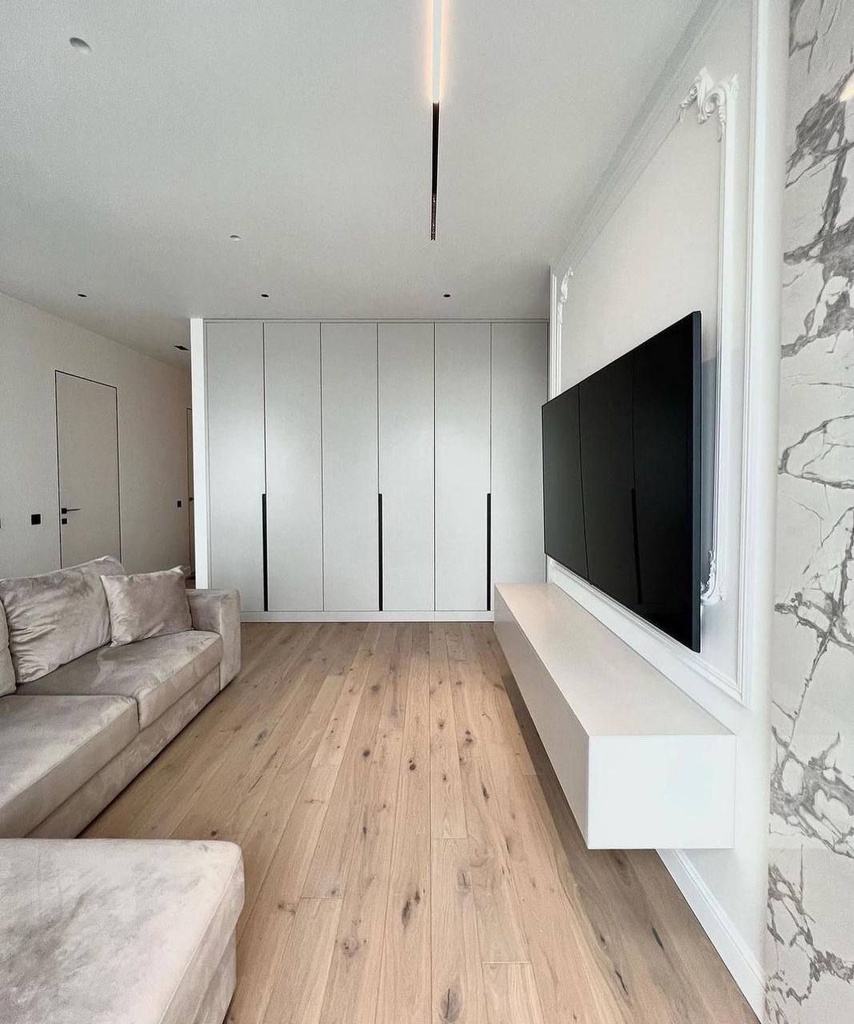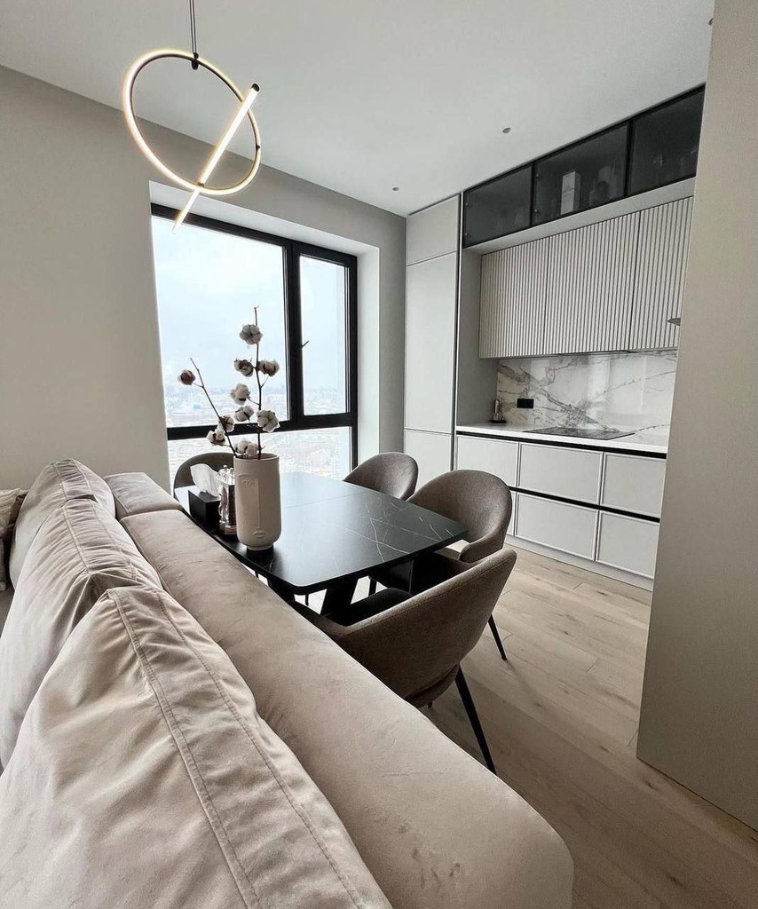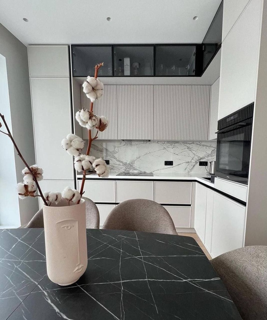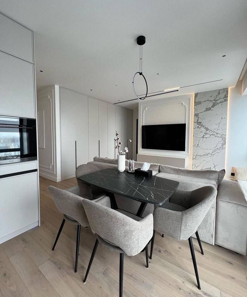 В гостиной организованы функциональные зоны: угловой диван, ТВ-зона с мраморной стеной и скрытыми системами хранения. Обеденная группа с черным мраморным столом и кольцевым светильником плавно переходит в компактную кухню с белыми фасадами и встроенной техникой.