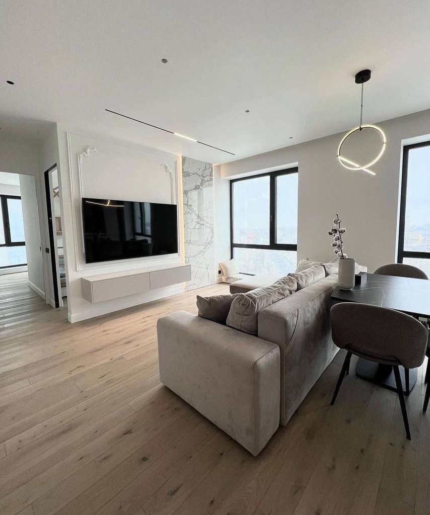 Студия дизайна интерьера SNATEK Art разработала дизайн-проект квартиры с открытой планировкой и кухней-гостиной. Панорамные окна наполняют интерьер светом. Нейтральная гамма из серых и белых оттенков в сочетании со светлым деревянным полом создает спокойную и элегантную атмосферу.