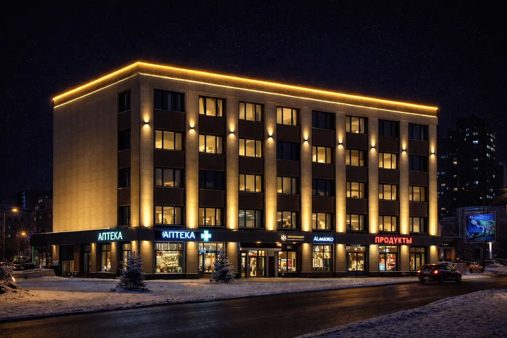 Архитектурное освещение очень важно в визуальном восприятии городской среды. Здания и сооружения, грамотно украшенные иллюминацией, получают эстетически привлекательный вид, создают определенную атмосферу местности. Архитектурная подсветка коммерческих помещений способна превратить любой фасад в настоящее произведение искусства.